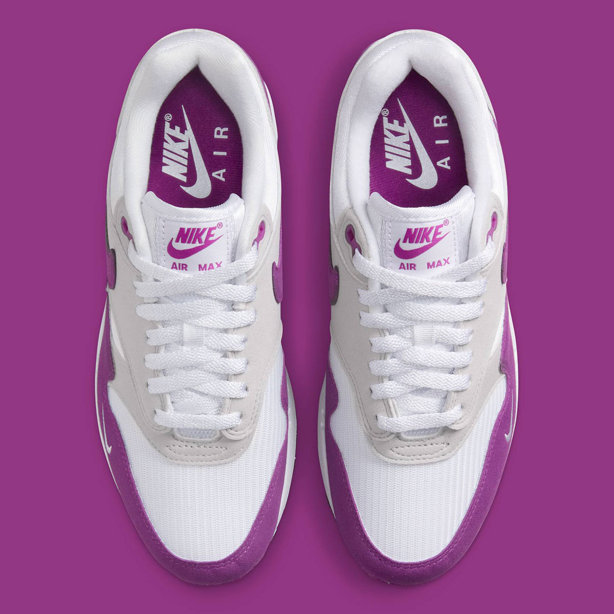 This “Bold Berry” take approaches the classic OG colorblocking of the Sport Red version, with the purple-ish hue touching the suede mudguard, Swoosh logo, and branding on the tongue and heel. The mainstay Neutral Grey appears on the quarter and heel, while the classic white sport mesh appears on the tongue. The only differentiator is the shrunken Swoosh that sits at the outer toe.