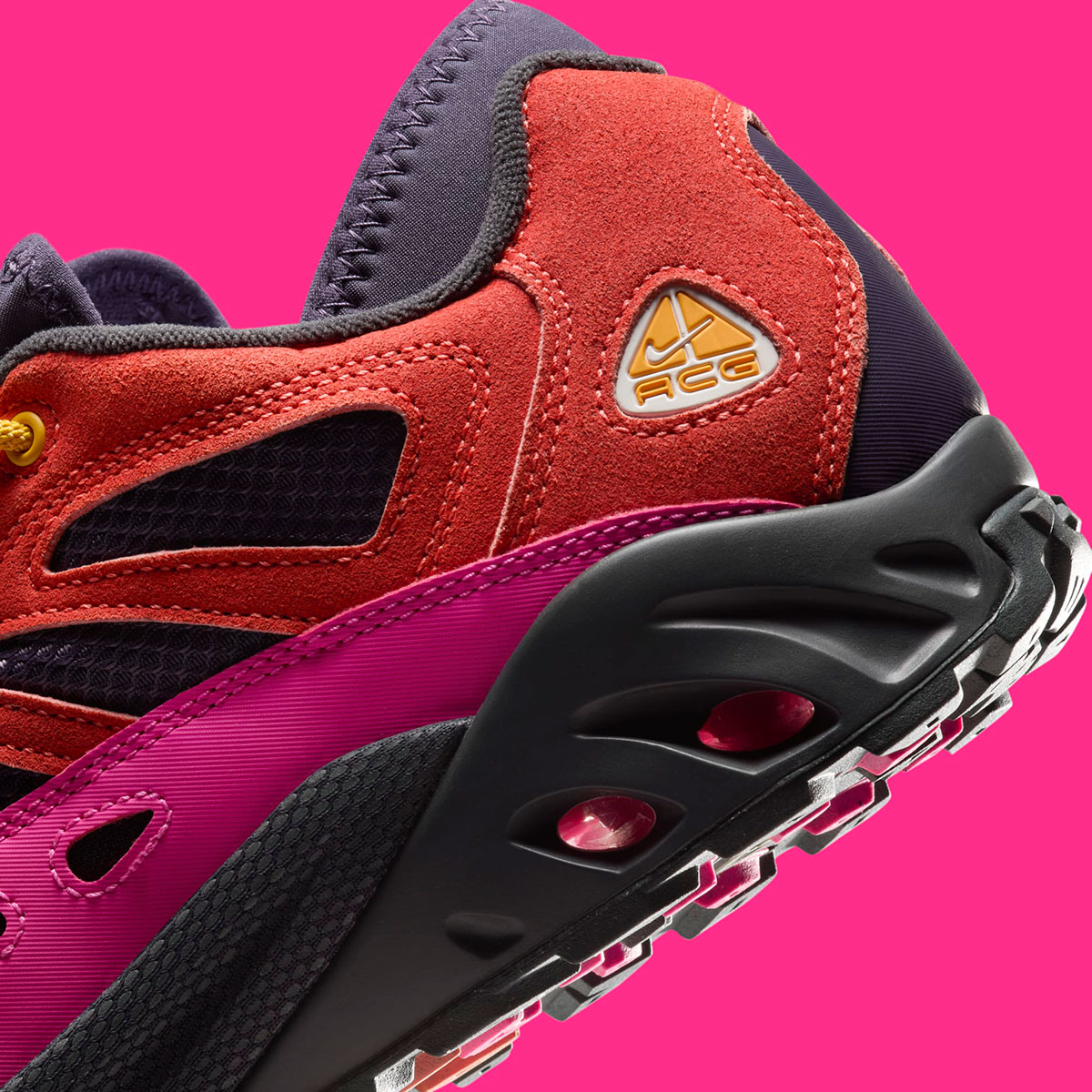 Rich in nostalgia, the top half of the shoes features a balanced mix of “Light Wild Mango,” “Laser Fuchsia,” and “Dark Raisin,” the latter of which accounts for the synthetic sock lining and midsole. Adding even more life to an already eccentric design, Nike also includes “University Gold” laces to match the retro ACG logo on the lateral heel.