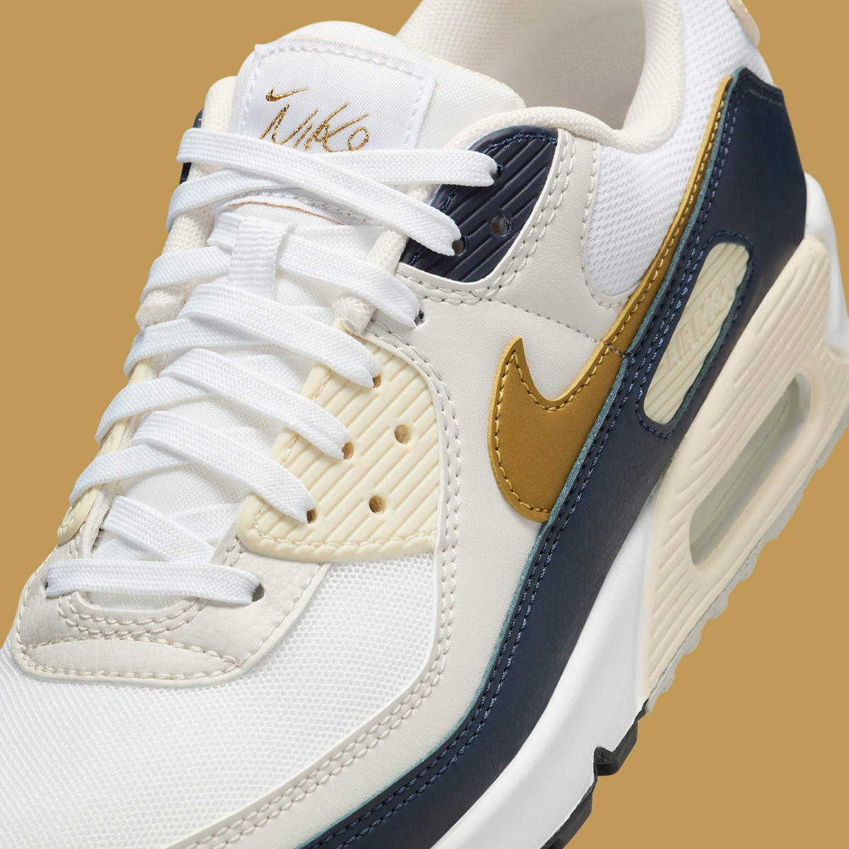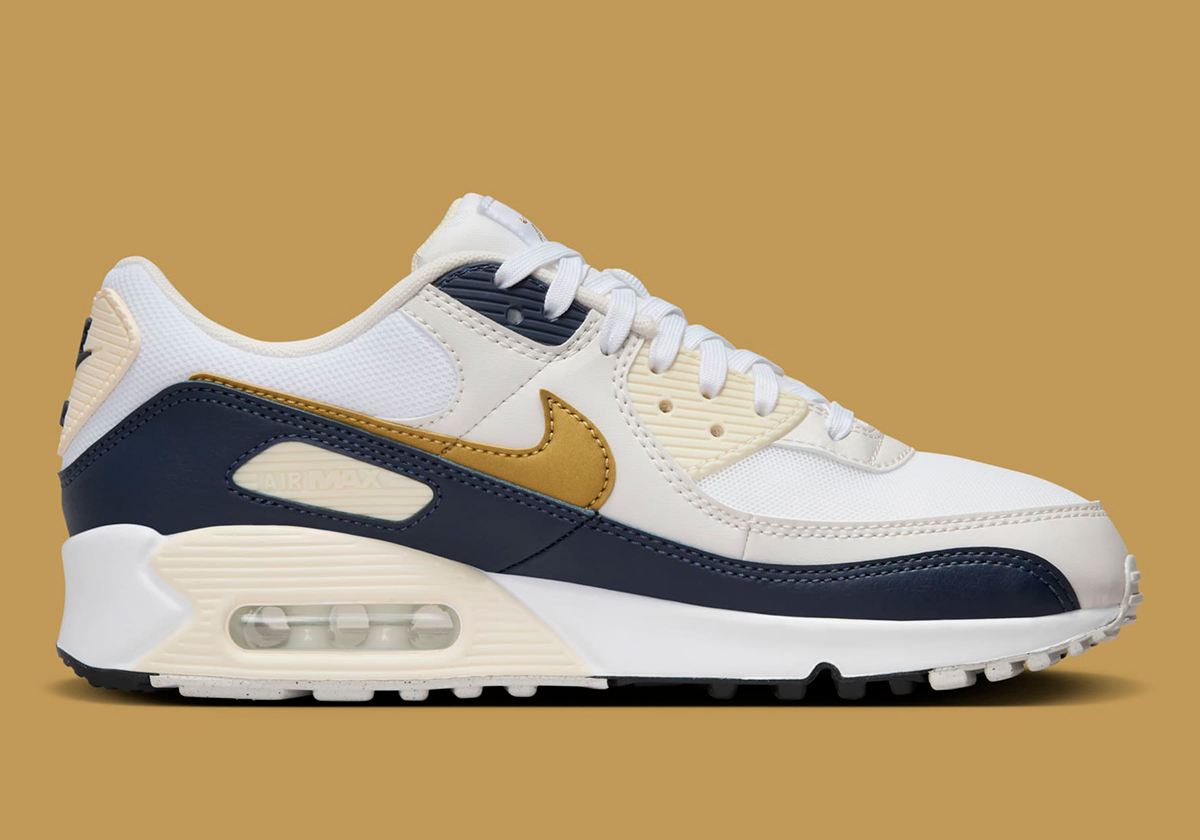 It’s a pretty simple arrangement on this shoe, leaning into pedigree and class rather than anything too gaudy. Off-white “Coconut” milk hits the ridged TPU sections, gold stand center on the Swoosh, and Navy accents via the leather swatch across the quarter.Of course, the Air Max 90’s most iconic look still live son in this arrangment, with grey & white leather & mesh underpinning each of those more striking elements.