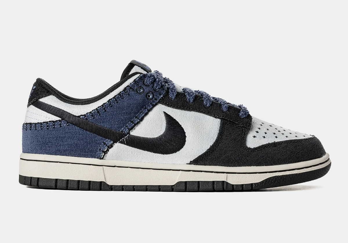 All the key hardware details of the monstrous colorway remain in place, including a suede base, canvas overlays, and exposed stitching around the heel. Embroidered Swoosh logos remain on both sides, the toe box features mini crosses, and shaggy, distressed-looking laces add even more intrigue. This composition gave us “Frankenstein” vibes when paired with a brown/olive colorway, but we’re getting a far less monstrous, more Sashiko-like aesthetic this time around. The heel, laces, and tongue tag come in “Sanded Purple,” while the rest of the sneaker skews toward black and white.