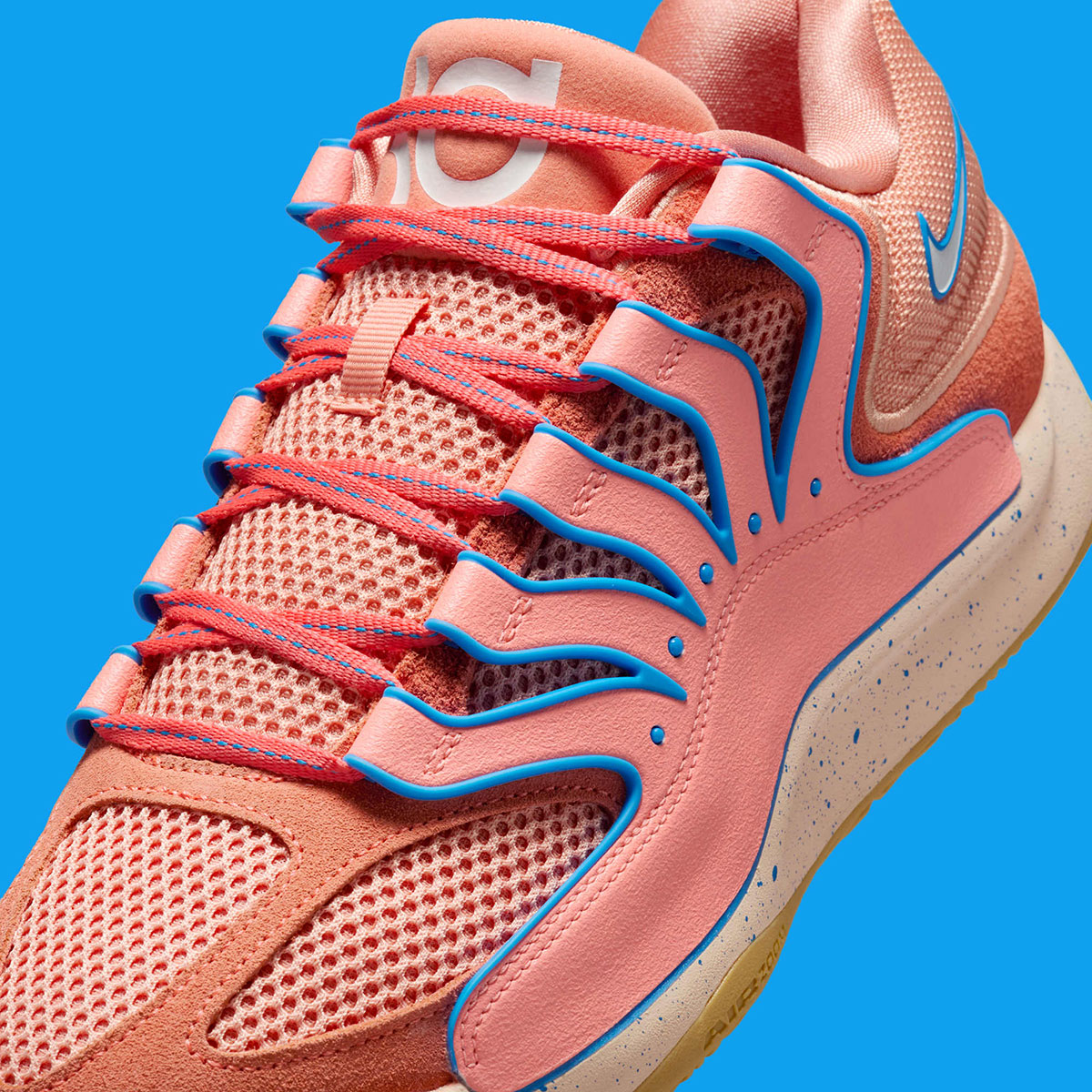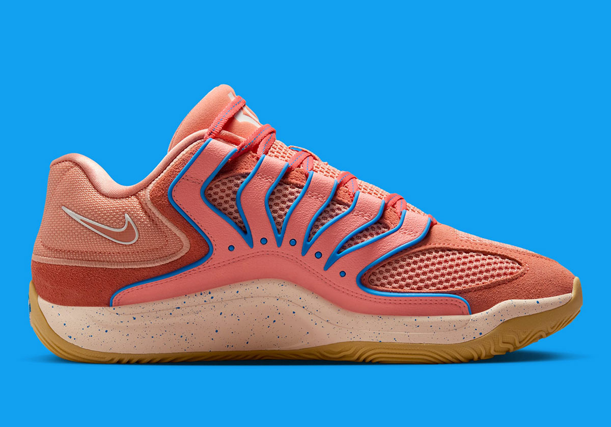 Yet a potential ode to where Kevin Durant rose to superstardom wouldn’t go very far in addressing the color combination here. Blending together “Atomic Pink/Light Wild Mango/Apricot Agate” in the upper pairs with an earthy counterpart in the gum sole, met by a midsole with blue speckles and a marble pattern within the circular cut-out at the heel.