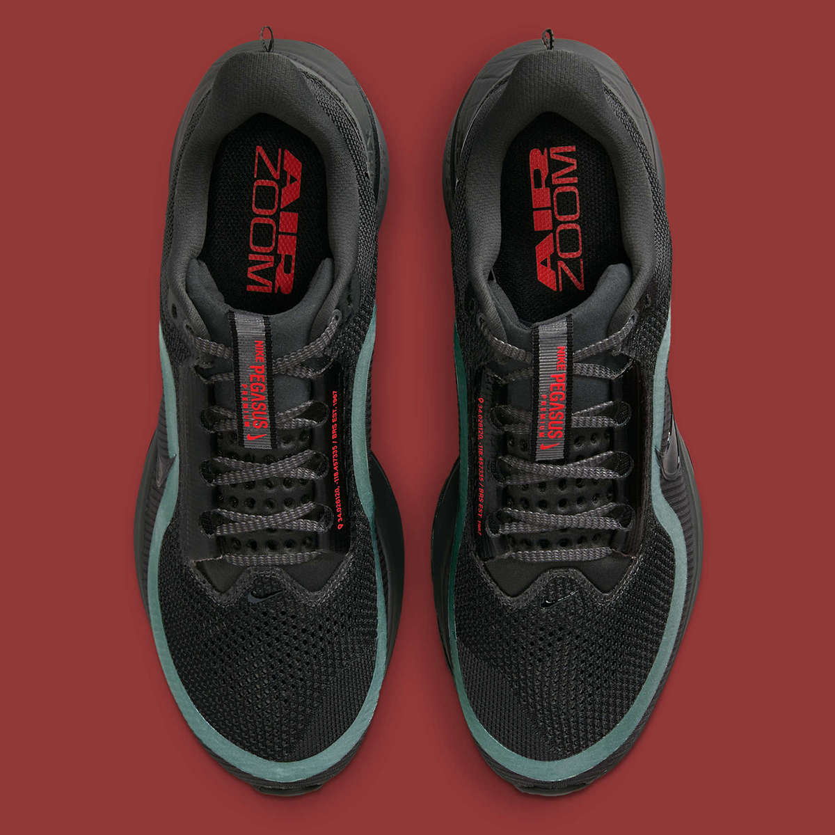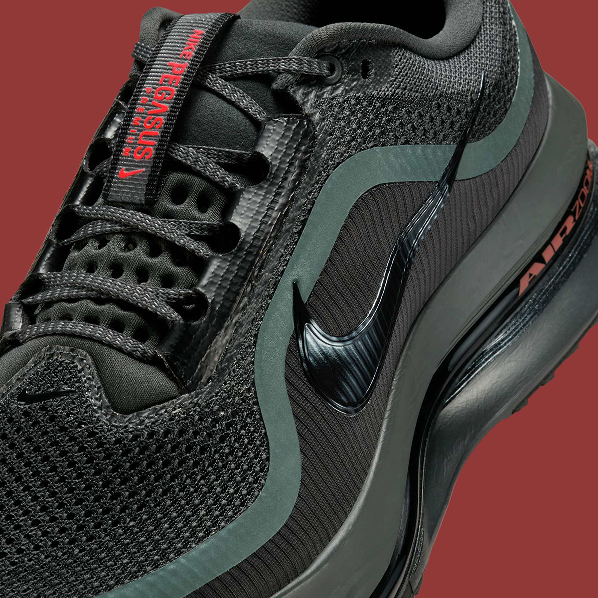 Incognito at its core, the sneaker appears mostly in shades of “Anthracite/Black/Smoke Grey.” Sage green synthetic “tape” can be seen wrapping around the upper, while “Bright Crimson” accents appear on the tongue, insoles, and full-length Air Zoom cushioning. The Pegasus Premium actually features three cushioning technologies; ZoomX, Air Zoom, and ReactX from the top-down.