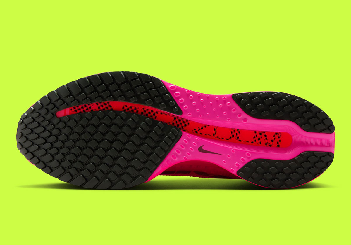 Even without seeing the shoe, you can capture the hi-vis variation just from the color codes: “Hyper Pink/Bright Crimson/Barely Volt/Sequoia.” Indeed, the all-pink profile of the shoe carries the visibility-minded atmosphere of running models past, carrying through the traffic light red and green insole. Notes of navy and black on the Swoosh and outsole ensure that there are at least some grounded tones on this shoe, but the point is made all the same. If you tend towards the louder side of the spectrum, this is an opportune time to get in on the cutting-edge of Nike’s tech: the combo of ZoomX, ReactX and Air Zoom cushioning remains in place.