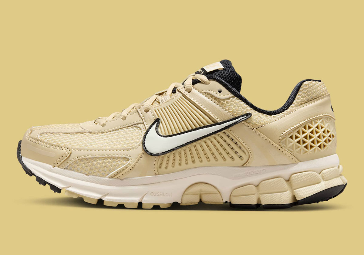 Here we have yet another case of contrmporary colors hitting the sporty tech runner silhouette. Official images reveal a uniform use of soft gold across the entire base, save for a white Swoosh featuring a black border. Black treatments appear on the lining and top portion of the tongue, mirrored underfoot by a gold midsole and black outsole. When it comes to materials, the next Vomero 5 opts for standard mesh underlays and all-leather overlays.