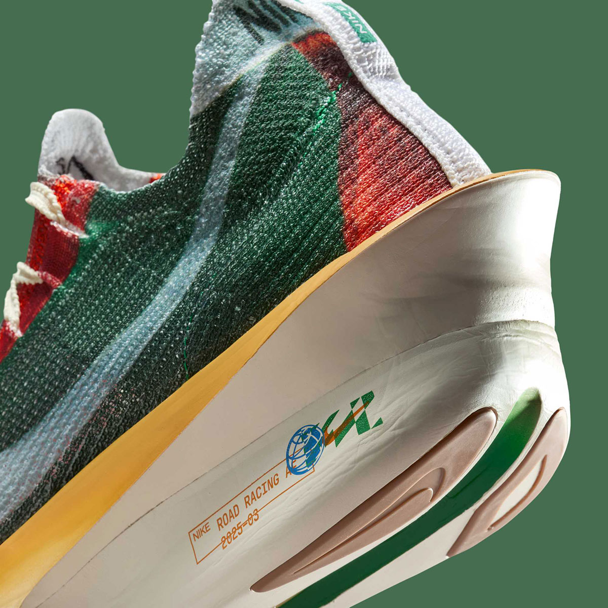 Next up in this series is the Nike ZoomX AlphaFly 3, reaching back to Nike’s The Sting, an early performance model released in the 1970s. What the nascent silhouette lends most clearly to its max-cushioned descendant is the green and orange combination that originally lived on its nylon build. Generally speaking, this shoe, perhaps fittingly, follows the similar hybrid between the Vaporfly and the Pre-Montreal, most visible with the pre-aged cushioning underfoot. Sadly, the D-ring eye-ley innovations from the OG sting don’t make it onto this design, but the homage to a simpler era is abundantly clear all the same in this next-gen proposition.