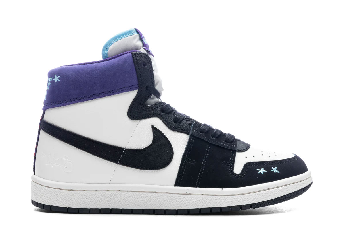 Right off the bat, you get hit with a clear “Charlotte Hornets” palette. The purple and blue shades that appear on the collar/tongue align perfectly with the team’s jersey colors, and Michael Jordan’s (former) franchise ownership serves as another fitting tie-in. Moreover, the bottom portion of the tongue reads “Designed In Charlotte,” a far cry from the brand’s French epicenter. Maybe there’s a Charlotte-based Opium affiliate behind the design, but context from Opium and Jordan Brand should provide a more definitive explanation as we creep closer to a release.