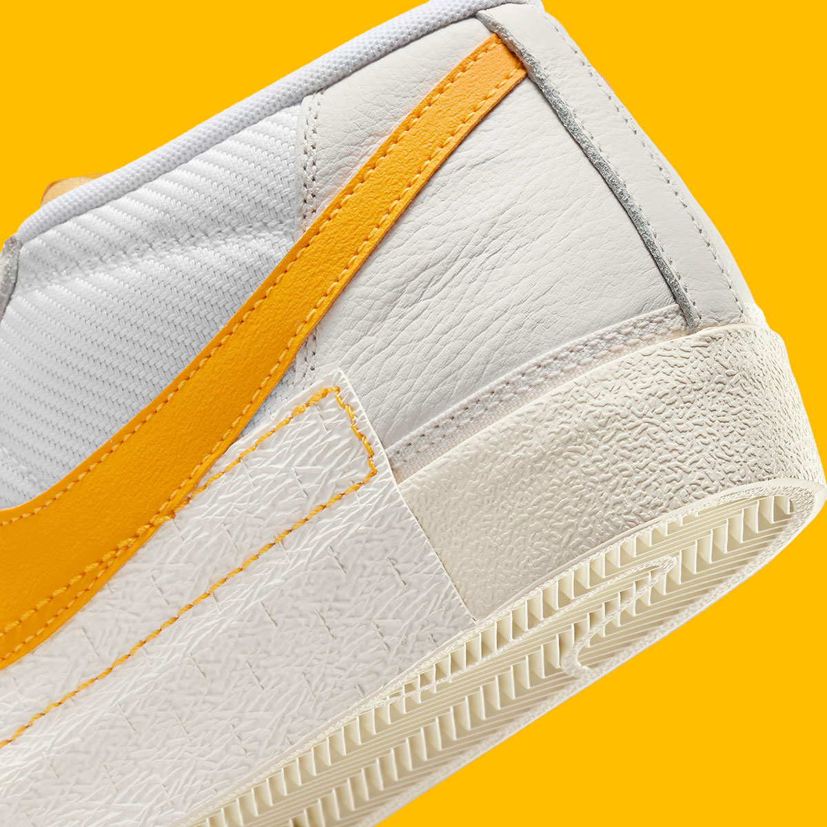 This is a microcosm of a frequent Nike strategy with offshoot models. Rather than continue experimental design in the palette, this shoe opts for a more conservative white & yellow layout, only interrupted by an off-white midsole and grey suede eyestays. It allows the out-of-left-field construction to speak for itself, and easier fit into consumer wardrobes than if it opted for a wilder color swatch. All the same, the added rubber swatch, modified foot entrance and exposed foam tongue carry enough to stand out from the mainline Nike Blazer.