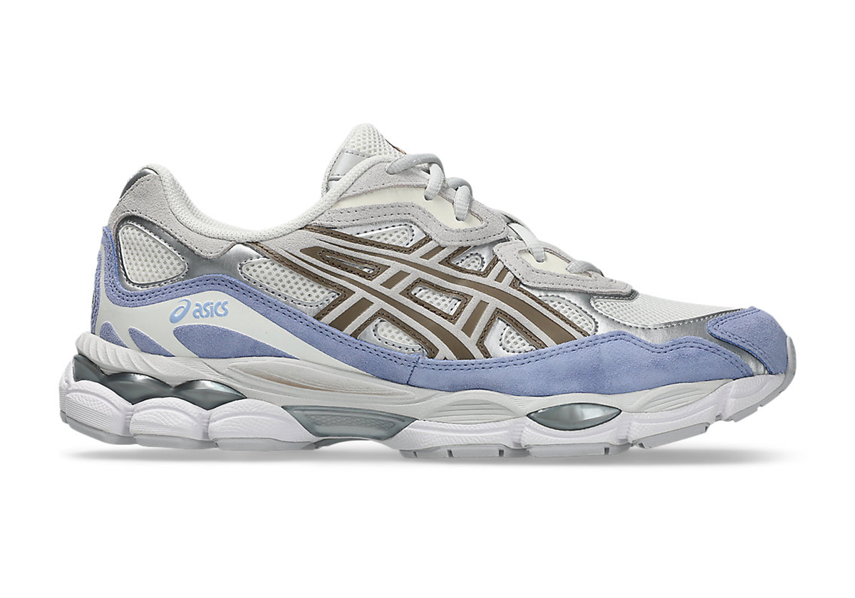 Simple “Cream” and “Cloud Grey” treatments set the tone, accounting for the bulk of the upper and midsole alongside metallic silver accents. Two key color placements make these pop, led by a suede, periwinkle blue mudguard. Brown detailing appears on the quarter of both side, matched by more brown hits on the tongue/heel logos.