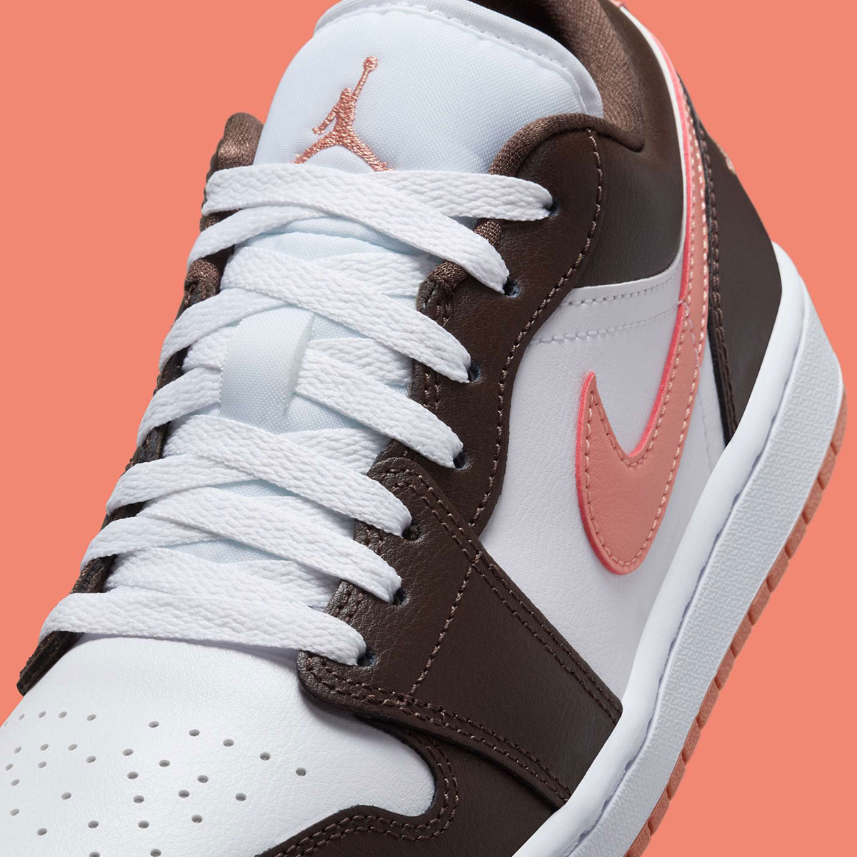 Enter the Air Jordan 1 Low: this mainstay for women is ready to be delivered to shops bearing a dark brown leather overlay matched with a coral-like coloring that is just a few shades away from pink. Keeping to a cool and calm temperament is the white leather base seen at the toe-box, mid-panel, and tongue.