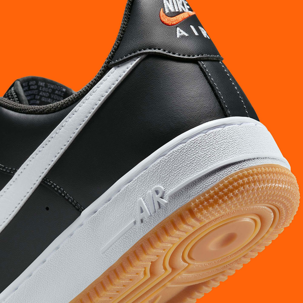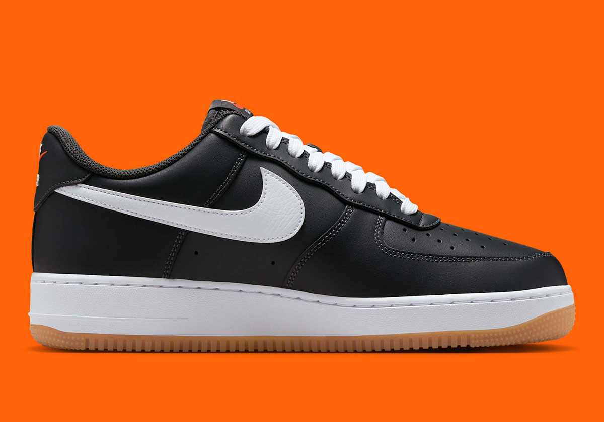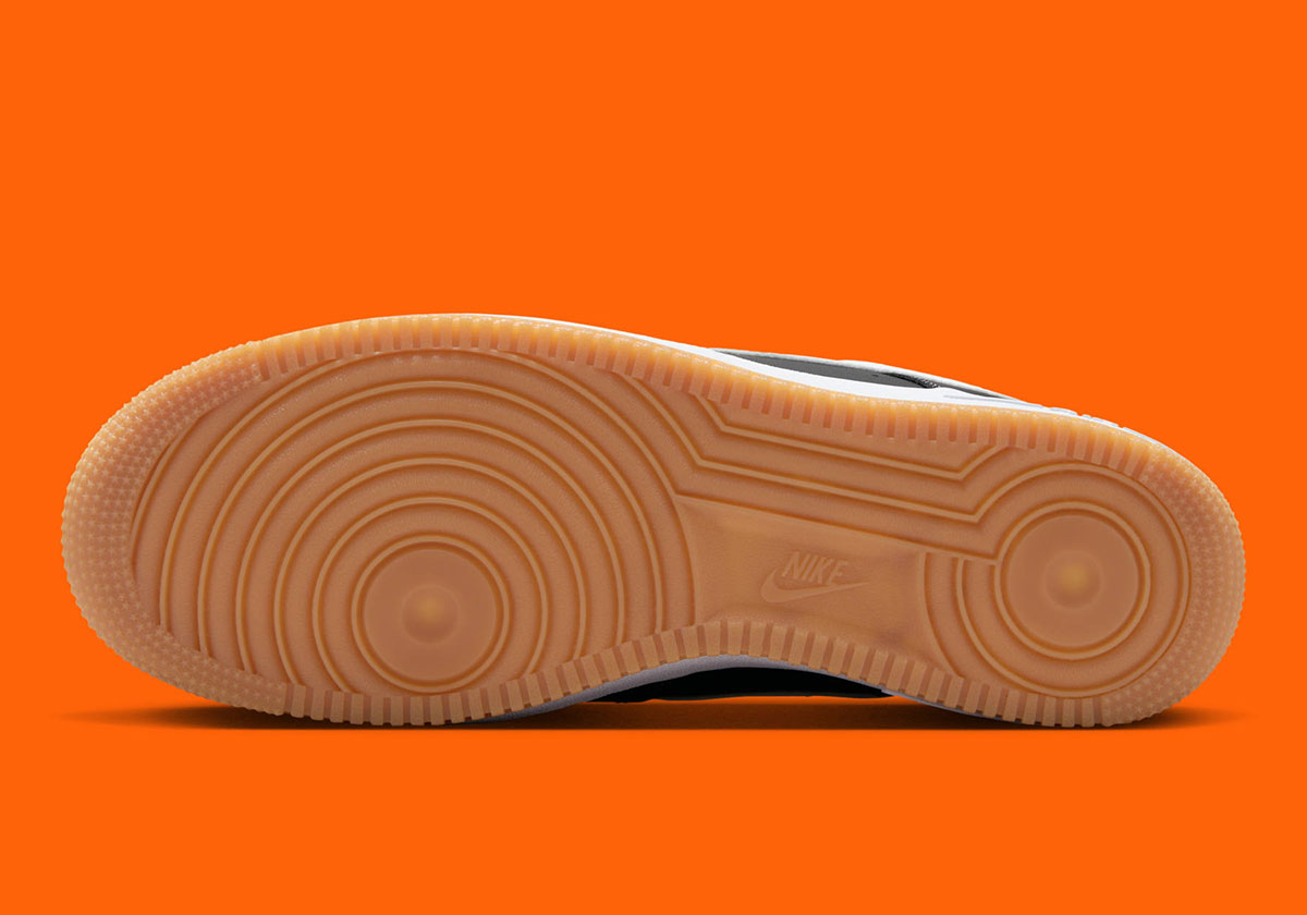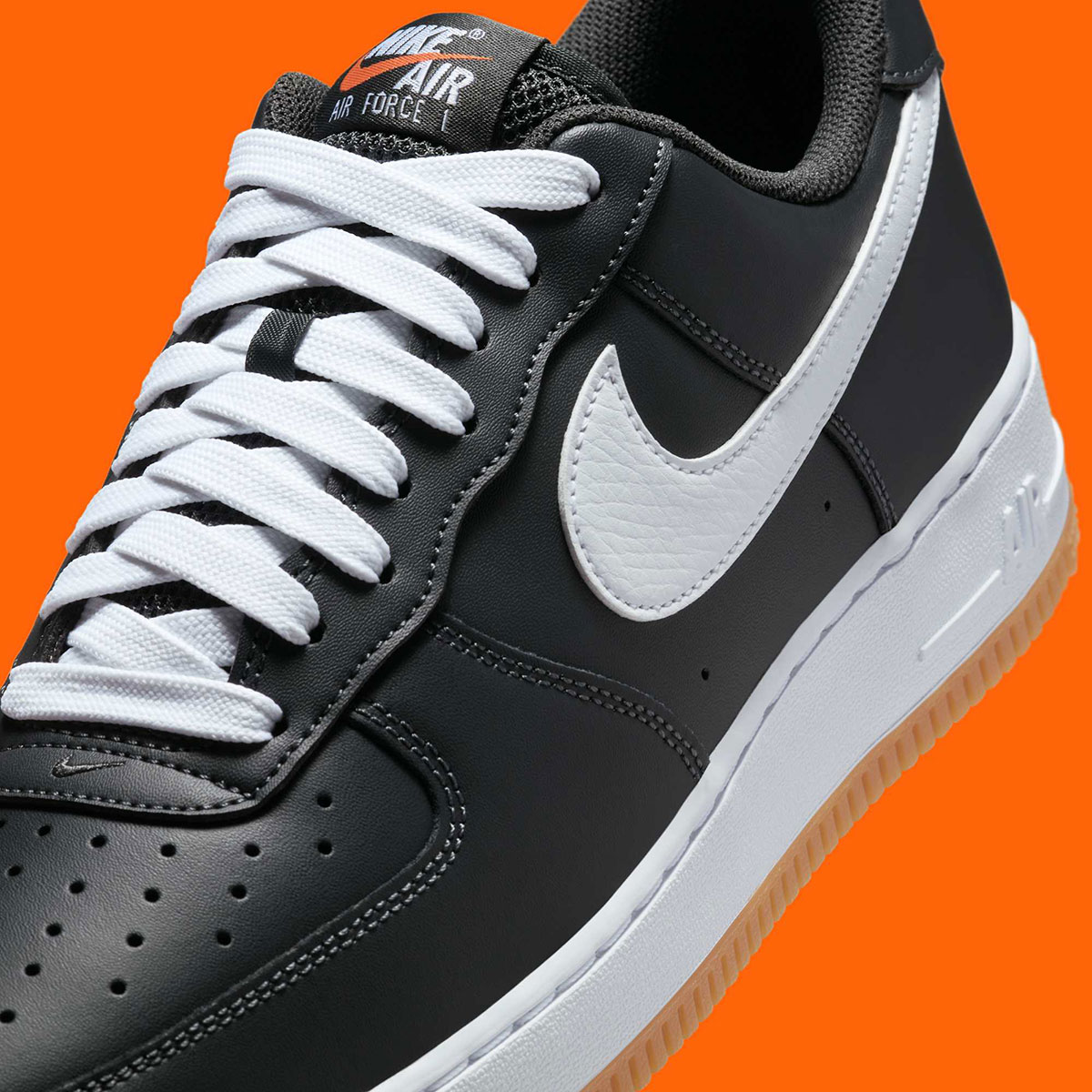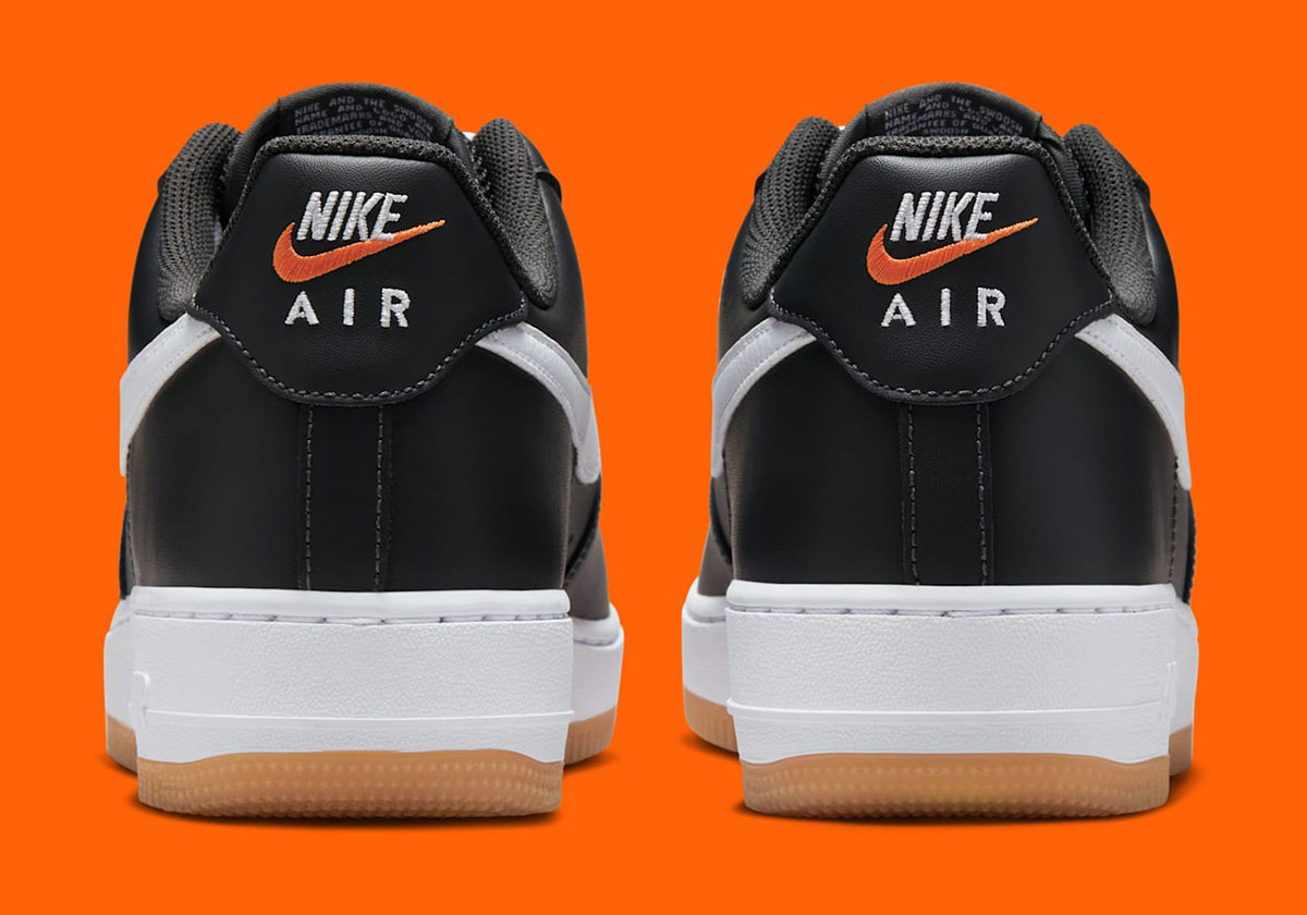 To plainly spell out the comp, it’s the gum-soled Courir Air Force 1 Low that immediately jumps to our minds. The ultra-simplistic arrangement of that ’02 edition makes subsequent pairs easy to tap into its register, as the shoe at hand does with its black leather foundation, gum bottoms and white Swooshes and midsole tones slicing through that arrangement. To ensure that “grail” piece still has territory to itself, Beaverton shifts the heel cup to black leather and utilizes orange embroidery on top of it.