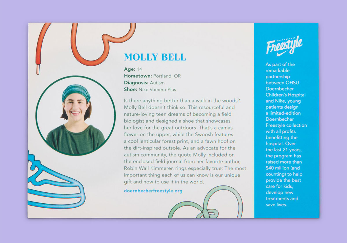Molly Bell’s dream of becoming a field biologist takes center stage on her Doernbecher sneaker for Spring 2026, a Nike Vomero Plus decorated with earth tones, florals, and a meaningful extra accessory.