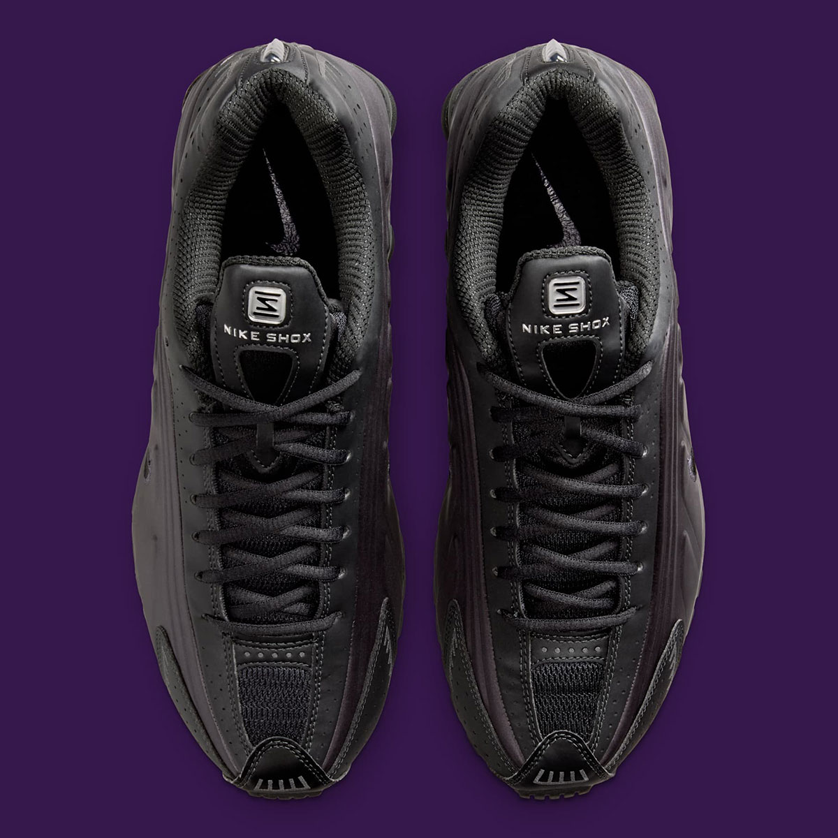 Indeed, rather than the dominant blend of greys and silvers we so frequently see in the tech runners and throwback basketball, here the Shox R4 pairs grape sidewalls with jet black anchoring around it, overtaking the collar, underfoot pistons, and a contrast panel at the toe. To ensure those start-of-the-century bonafides aren’t entirely lost, chrome accents sneak in on the jeweled branding hit on the tongue and in the linework on the heel, further adding some hi-visibility pop to an otherwise entirely understated colorway.