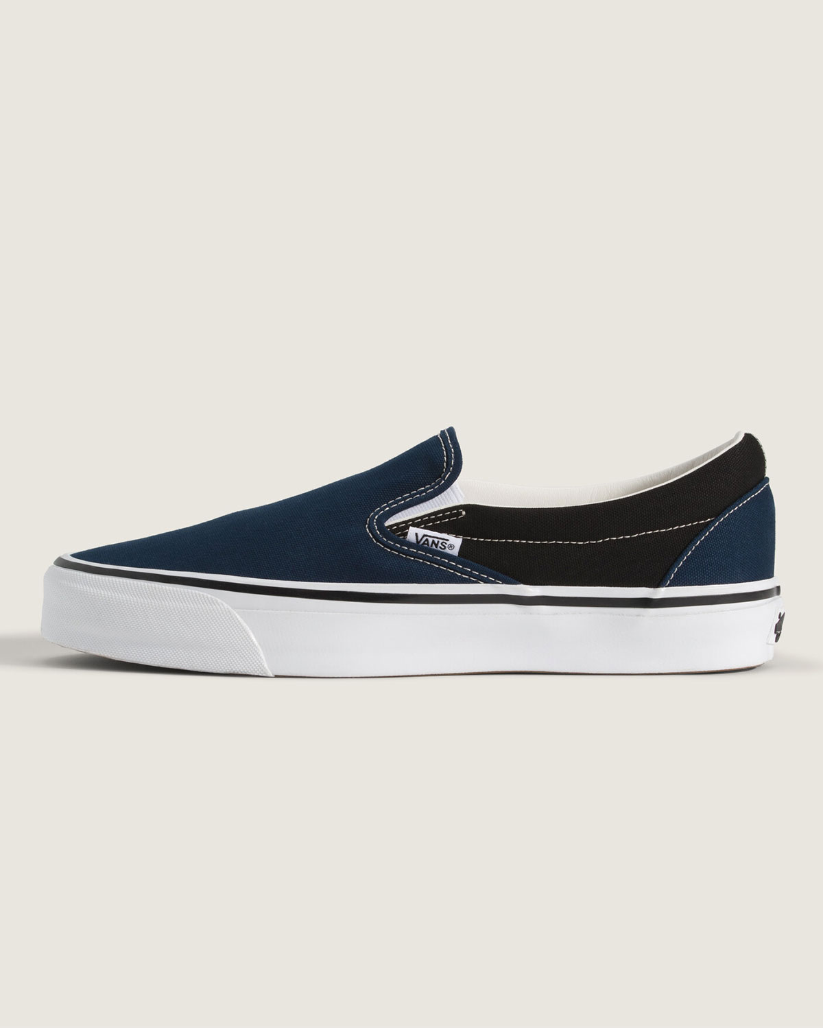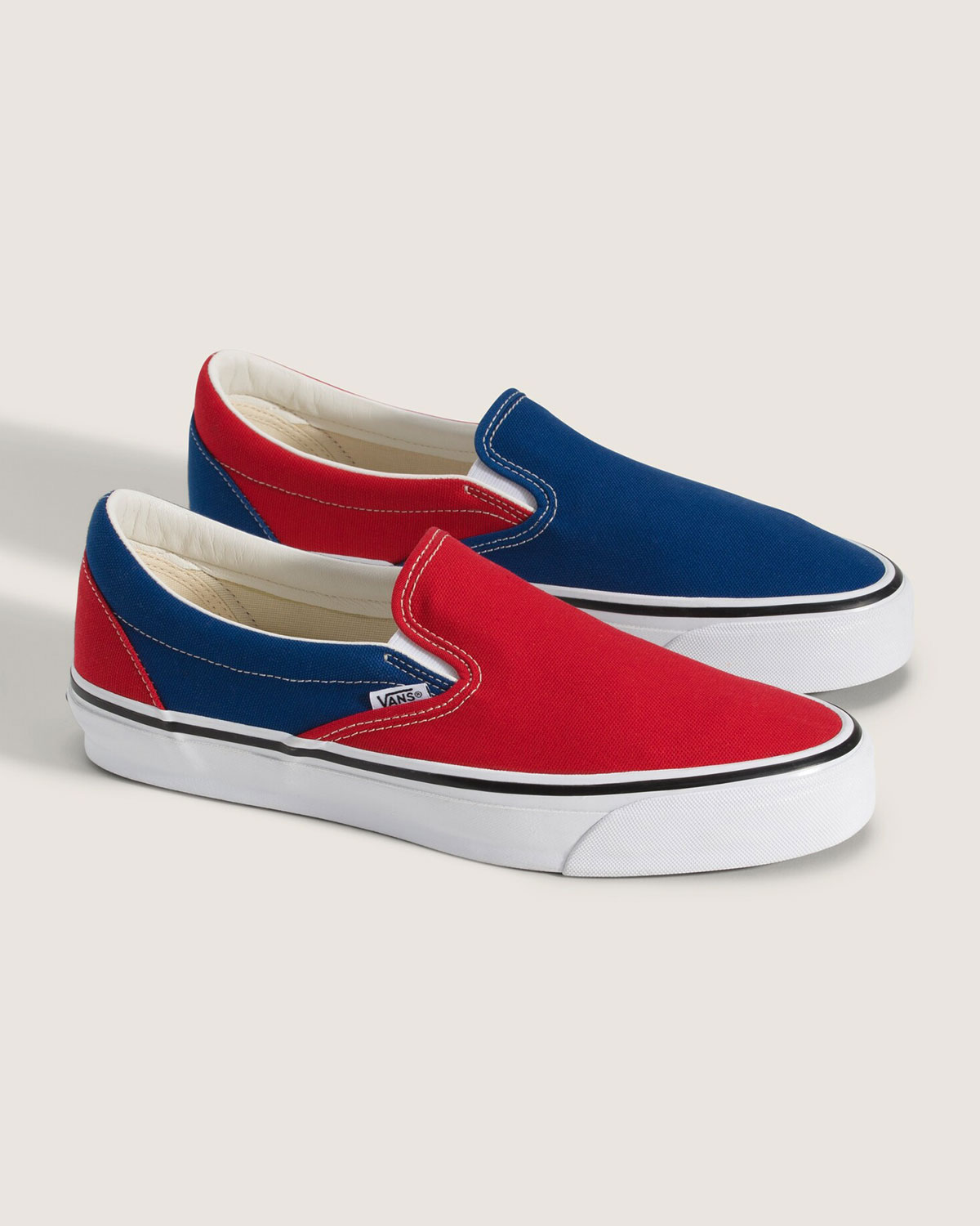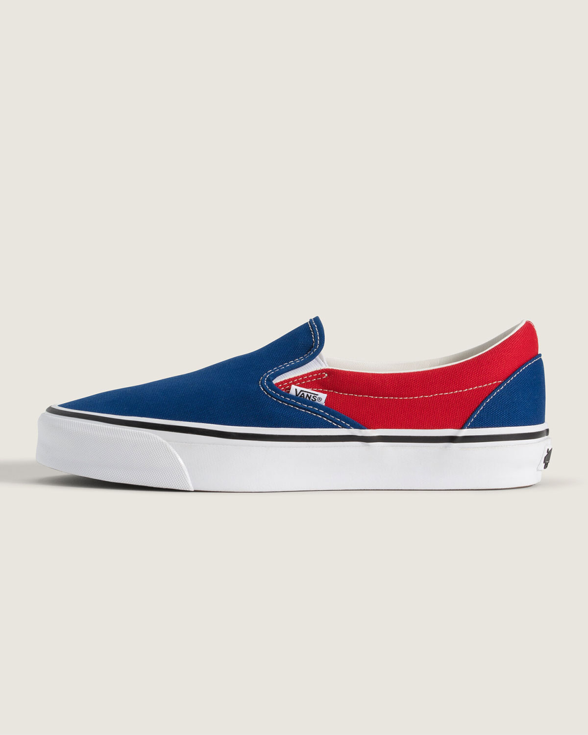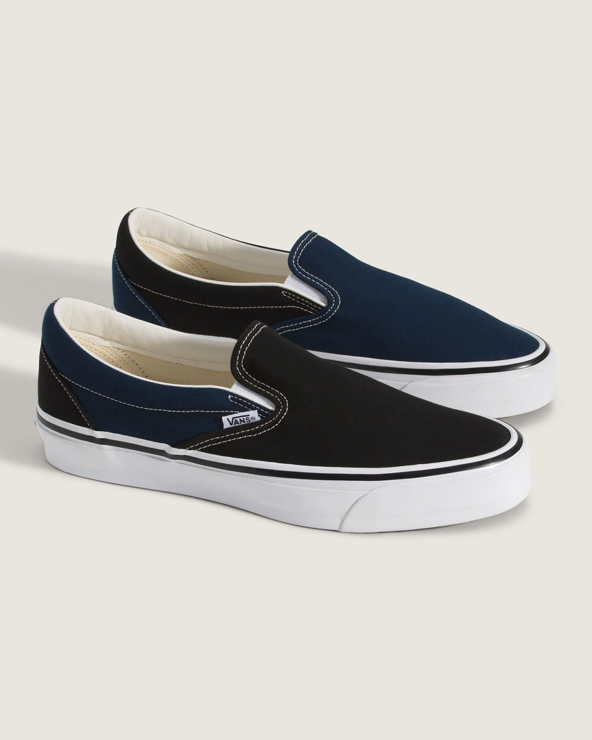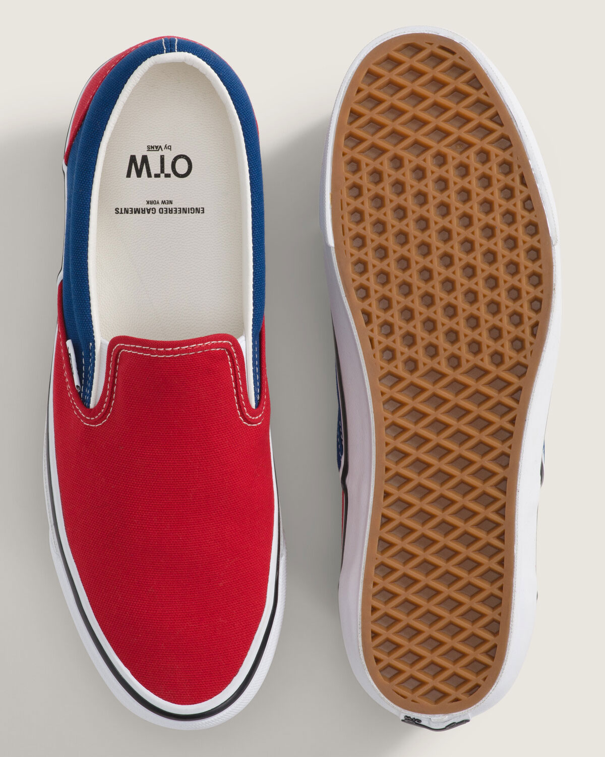 Two mismatched Slip-On colorways are on tap, led by a red and blue pair that tributes the first ever Vans model in the Authentic (originally called the Style #44). Early Vans devotees, namely iconic skater Tony Alva, would rock mismatched red and blue Authentics as one sneaker would wear down quicker than the other. Vans’ first true skate shoe in the Era (Style #95) would later debut in a red/blue colorway for that reason, and such is the reference alluded to the Engineered Garments collab we have before us today. The other colorway is one of a more low-key variety, taken with the same mismatched color blocking but in black/navy blue. Both looks feature white sidewalls, OTW branding at the heel, and that essential gum brown outsole underfoot.