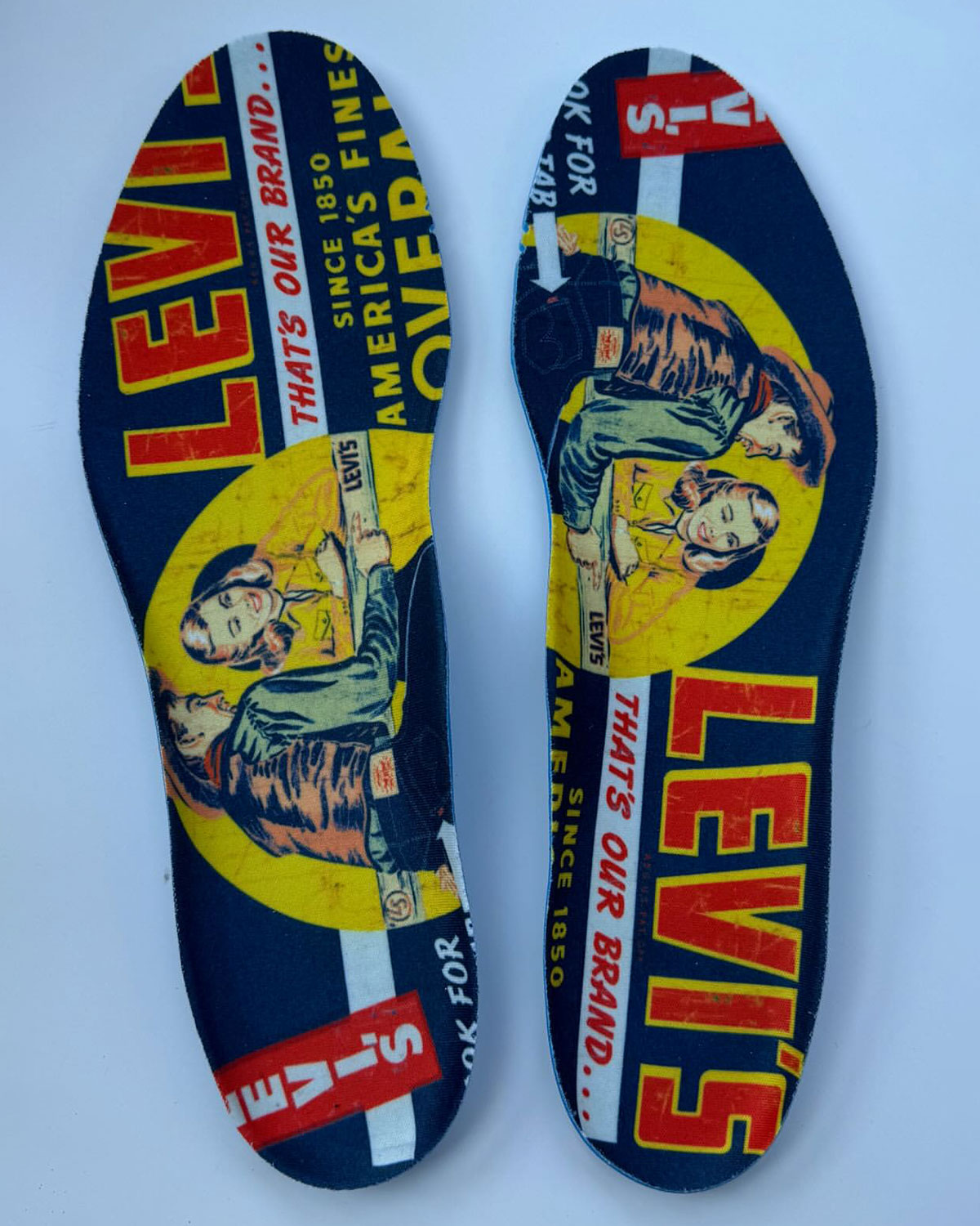 Unveiled here by Leo Gamboa, who manages all of Levi’s collaborations, the friend & family Levi’s 95s feature a dark, almost selvedge-like blue denim upper. While all three public colorways are essentially monochrome, the F&F pair stands out with a red/yellow tongue logo and red Air bubbles. The real highlight is custom insoles featuring vintage Levi’s ads, taken in red, yellow, and blue to match the accent touches.