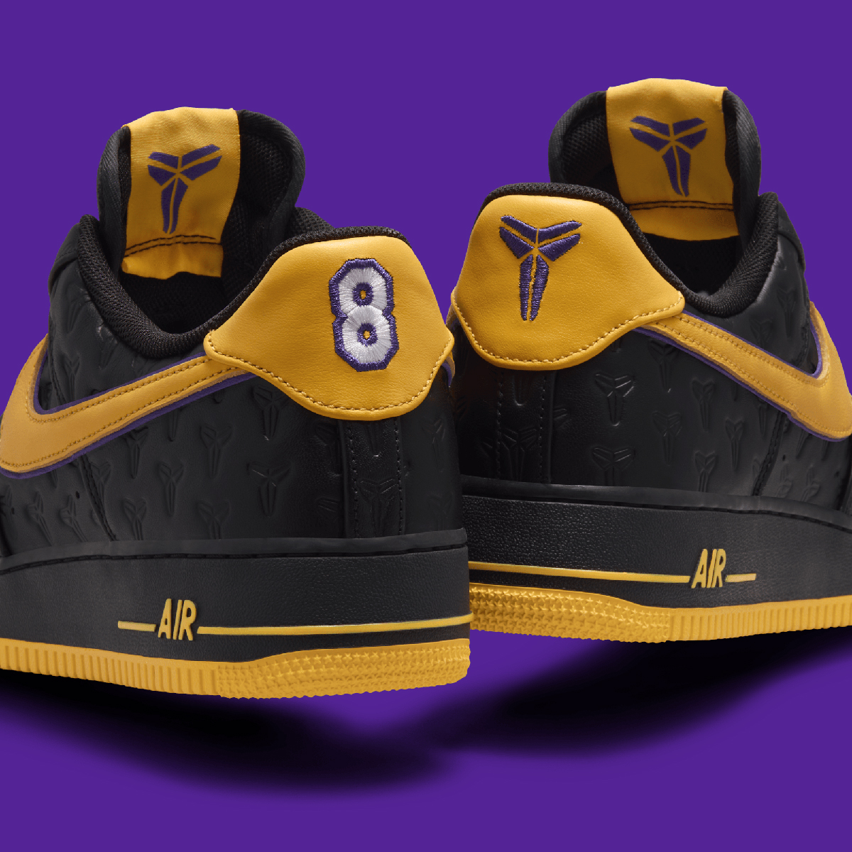 Much of the layout from the white edition remains in place for its nocturnal peer; mismatched embroidery on the heel between From Kobe’s #8 and the tri-tip Mamba logo he’d adopt in later years. A double ply Swoosh splits between the Laker’s two primary tones, Bryant’s signature appears gilded on the tongue, and the pair arrives with two sets of laces that align with those vibrant shades. The main draw for the Kobe Air Force 1 “Black,” however, is the all-over embossed pattern, planting the Kobe logo comprehensively throughout the shoe. Add that to the aforementioned limited nature and you’ve got the perfect recipe for one of the most coveted shoes of this Holiday season.