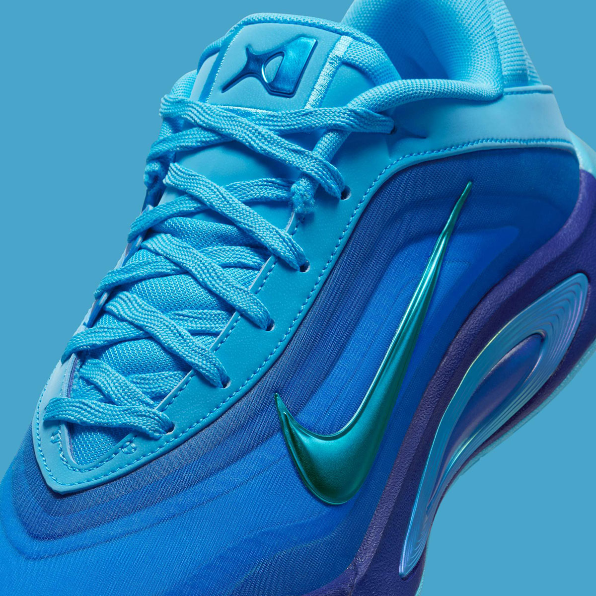 Moving onto the “Indigo Girl” A’One, the colorway is inspired by A’ja’s childhood nickname and bright-blue energy. Moreover, in 2021, A’ja published a video called The Indigo Child on The Players’ Tribune describing the racism she experienced as a child (and how it inspired her to be a role model for Black girls). Dark “Blue Fury” treatments account for most of the base, while upper portions and outsole appear in lighter “Photo Blue.”