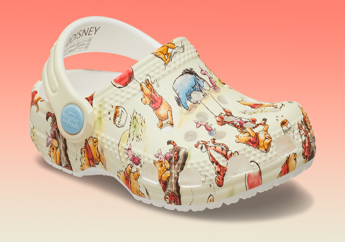 Meanwhile, for little ones, the Crocs Classic Clog features colorful illustrations inspired by E. H. Shepard’s original artwork. Winnie, Eeyore, Tigger, and Piglet make several appearances over a cream-colored backdrop, while light blue Disney branding stands out on the strap securing points.